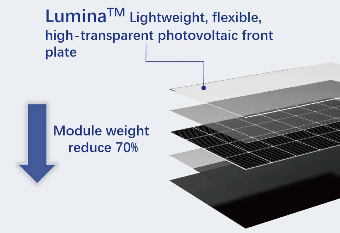 優美特的解決方案:Lumina™輕量化革新,針對行業痛點,優美特依托20年復合材料研發與應用經驗,推出創新產品Lumina™光伏前板。該產品以丙烯酸樹脂與玻璃纖維為核心材料,重量較傳統玻璃組件減輕70%,保證組件可靠性的同時顯著降低屋頂加固需求與安裝成本。其技術優勢包括: