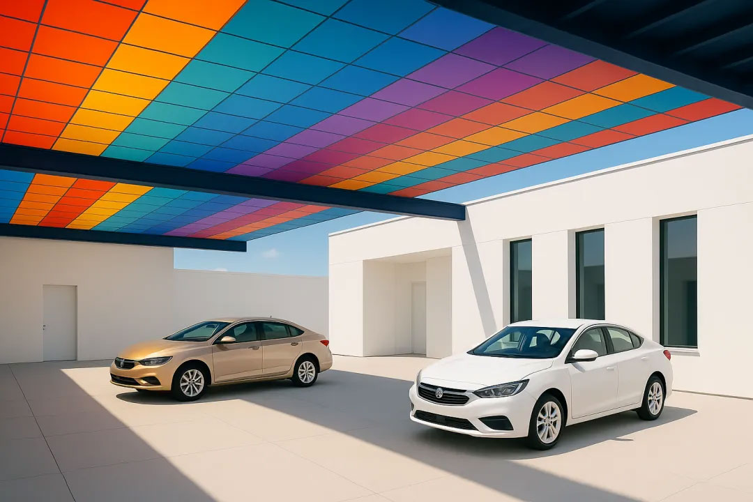彩色光伏的出現,不只是材料技術的一次躍進,更是能源產品向“美學價值”延展的標志。彩色光伏板通過光子晶體、油墨打印、介質膜層等技術,實現了紅、藍、綠、金等多元色彩,甚至能定制圖案、LOGO 或藝術紋樣。這些色彩不再是簡單的視覺符號,而是科技與建筑對話的全新語言。