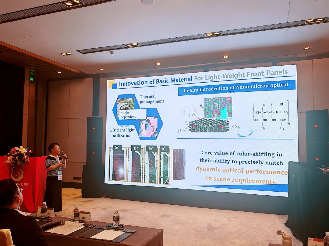 由優美特研發工程師蔡曉嬌主講,她指出,隨著光伏建筑一體化(BIPV)應用的快速發展,封裝材料對美觀性與高效性能的雙重要求愈加顯著。通過對改性聚烯烴(POE)基材與多層納米鍍膜技術的研究,確保炫彩前板在高溫、高濕、強紫外等復雜環境下仍具優異的機械性能與耐候表現。