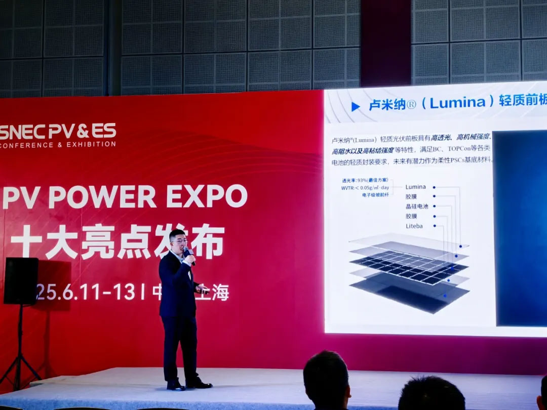 光伏業務總監張瀟圍繞柔性光伏封裝的關鍵挑戰,詳細介紹了盧米納®輕質高透封裝前板的結構優勢。該產品在保證柔性彎折特性的同時,具備優異的抗黃變能力,為柔性組件提供穩定可靠的封裝解決方案,助力輕量化光伏場景落地應用。